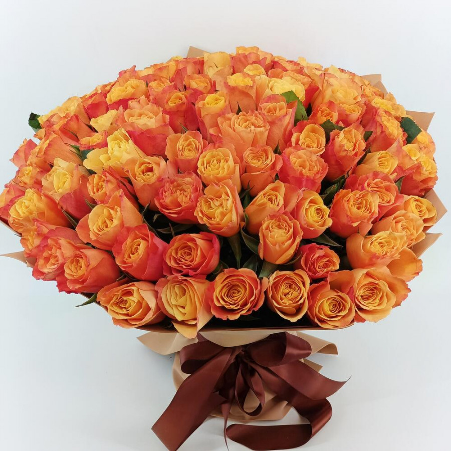 На фото букет из 101 оранжевой розы. В составе: роза 101 шт, крафт-бумага 2 шт, атласная лента 2 шт, . Все цветы свежие и ароматные, букет красиво оформлен и отлично подходит для подарка. Доступна доставка цветов или самовывоз.