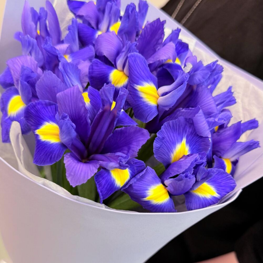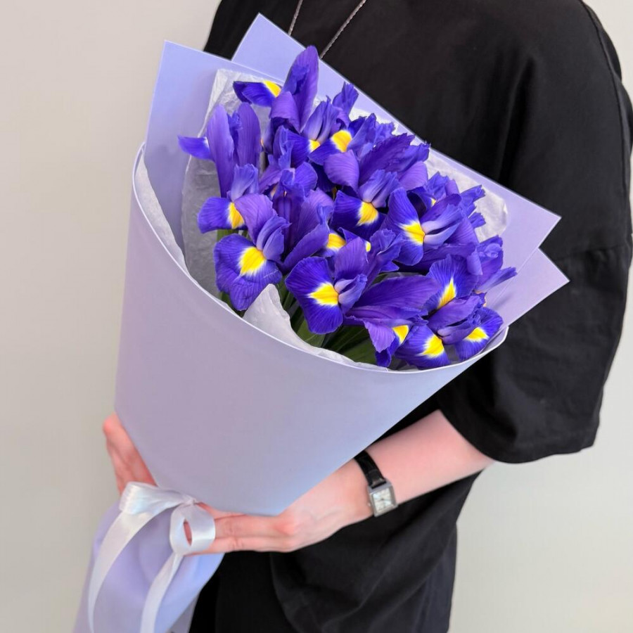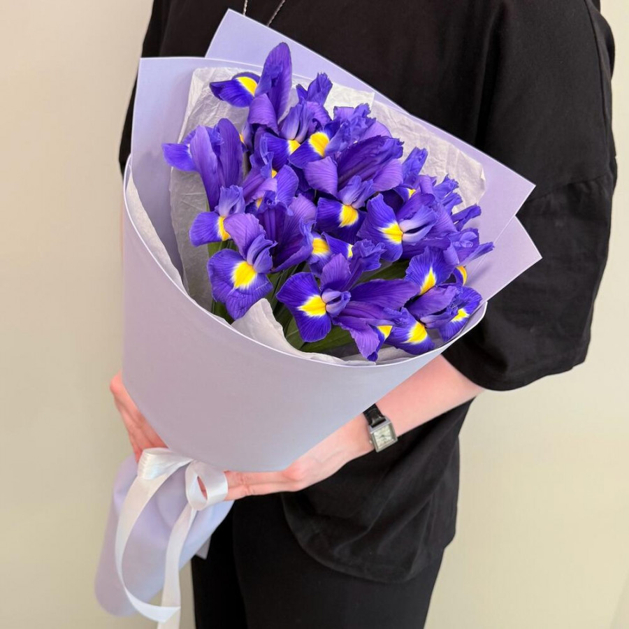На фото букет из 11 фиолетовых ирисов. В составе: ирис 11 шт, фоамиран 2 шт, атласная лента 1 шт, . Все цветы свежие и ароматные, букет красиво оформлен и отлично подходит для подарка. Доступна доставка цветов или самовывоз.