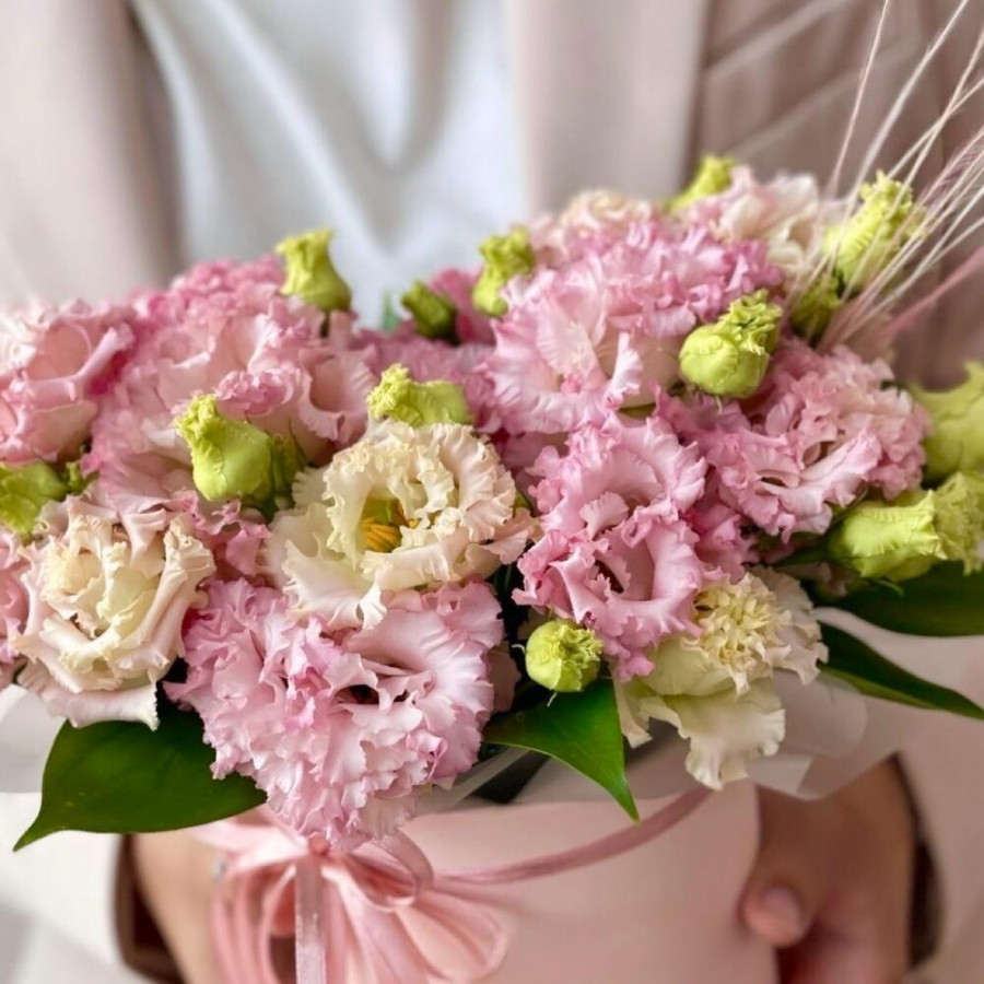 На фото композиция 11 розовых эустом в коробке. В составе: эустома (лизиантус) 11 шт, рускус 5 шт, оазис флористический 1 шт, шляпная коробка (m) 1 шт, атласная лента 1 шт, . Все цветы свежие и ароматные, букет красиво оформлен и отлично подходит для подарка. Доступна доставка цветов или самовывоз.