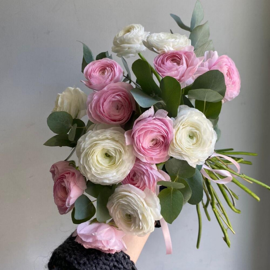 На фото 15 белых и розовых ранункулюсов. В составе: ранункулюс 15 шт, эвкалипт 2 шт, атласная лента 1 шт, . Все цветы свежие и ароматные, букет красиво оформлен и отлично подходит для подарка. Доступна доставка цветов или самовывоз.