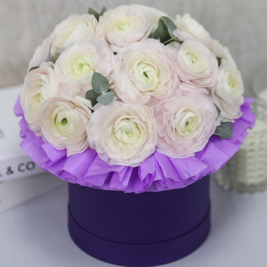 На фото 17 белых ранункулюсов в шляпной коробке. В составе: ранункулюс 17 шт, эвкалипт 2 шт, шляпная коробка (s) 1 шт, . Все цветы свежие и ароматные, букет красиво оформлен и отлично подходит для подарка. Доступна доставка цветов или самовывоз.