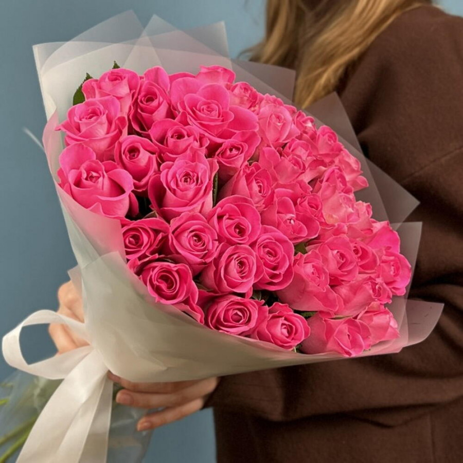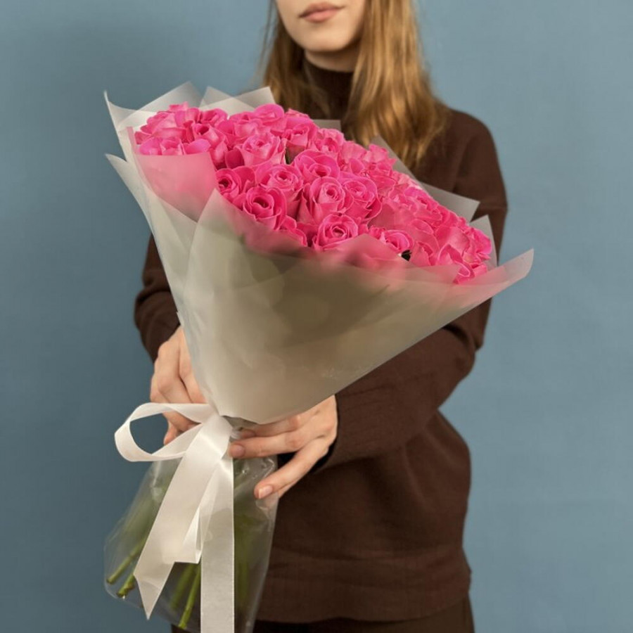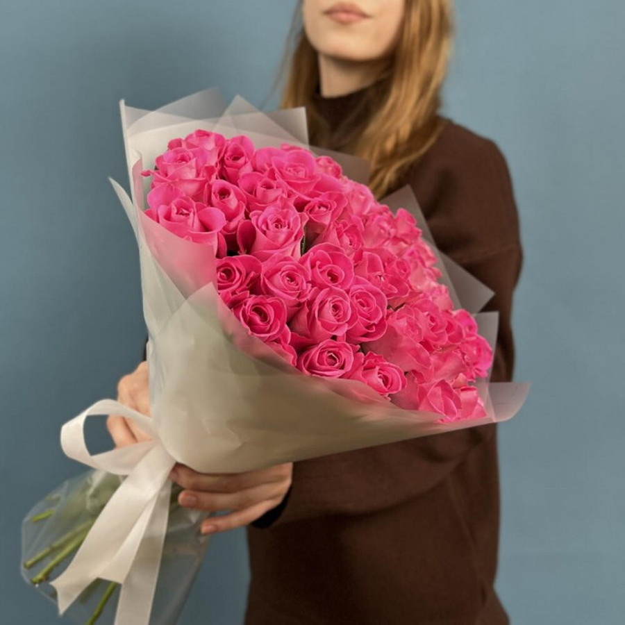 На фото букет из 41 розовой розы. В составе: роза 41 шт, дизайнерская упаковка 1 шт, атласная лента 1 шт, . Все цветы свежие и ароматные, букет красиво оформлен и отлично подходит для подарка. Доступна доставка цветов или самовывоз.
