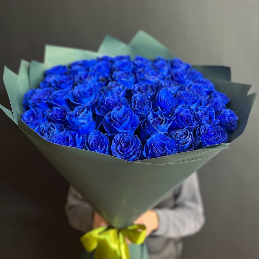 На фото 49 синих роз в дизайнерской упаковке. В составе: роза (синяя) 49 шт, дизайнерская упаковка 2 шт, атласная лента 1 шт, . Все цветы свежие и ароматные, букет красиво оформлен и отлично подходит для подарка. Доступна доставка цветов или самовывоз.