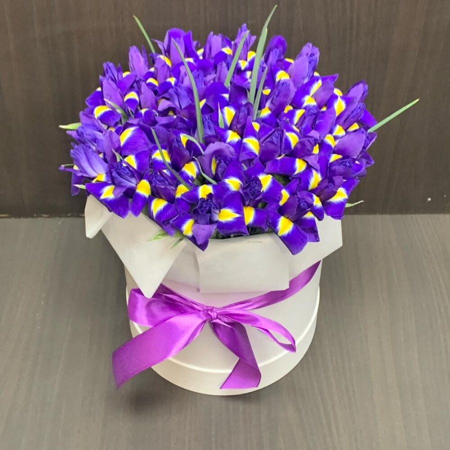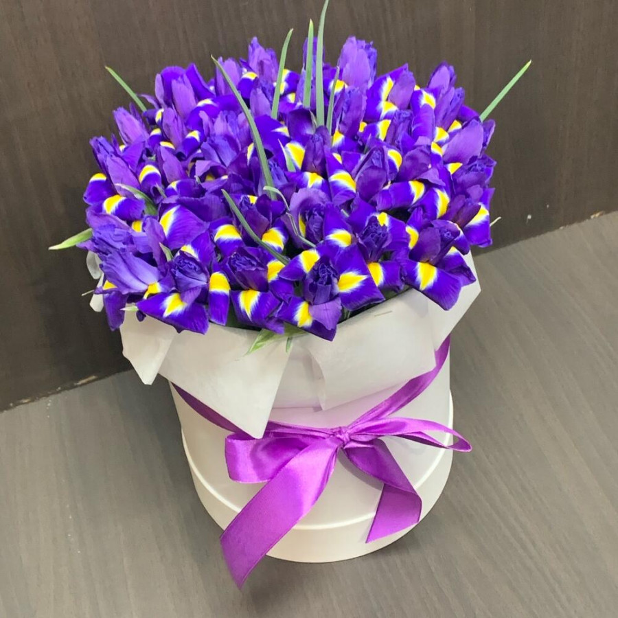 51 фиолетовый ирис в шляпной коробке