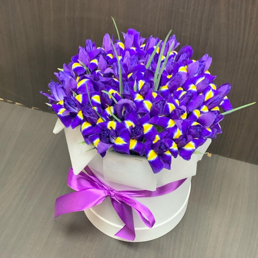 На фото 51 фиолетовый ирис в шляпной коробке. В составе: ирис 51 шт, оазис флористический 2 шт, шляпная коробка (l) 1 шт, атласная лента 1 шт, . Все цветы свежие и ароматные, букет красиво оформлен и отлично подходит для подарка. Доступна доставка цветов или самовывоз.