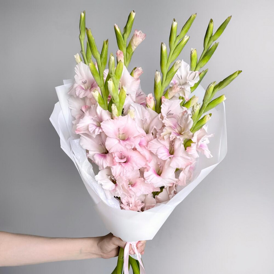 На фото букет из 9 розовых гладиолусов. В составе: гладиолус 9 шт, дизайнерская упаковка 1 шт, . Все цветы свежие и ароматные, букет красиво оформлен и отлично подходит для подарка. Доступна доставка цветов или самовывоз.