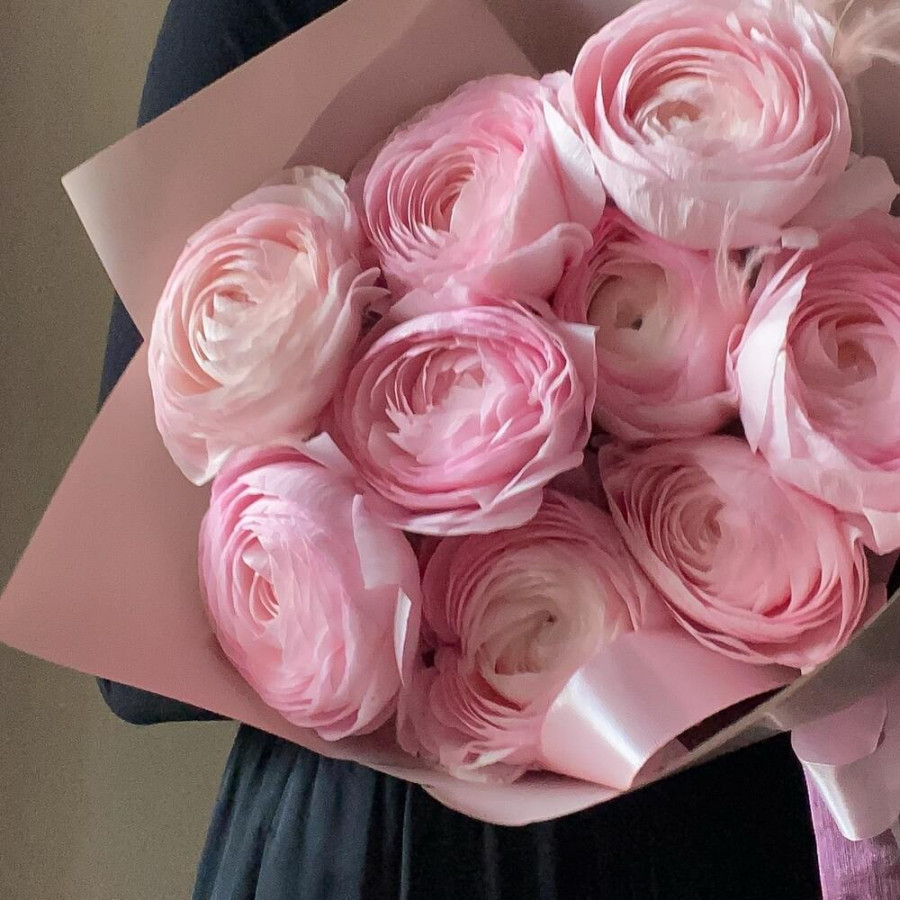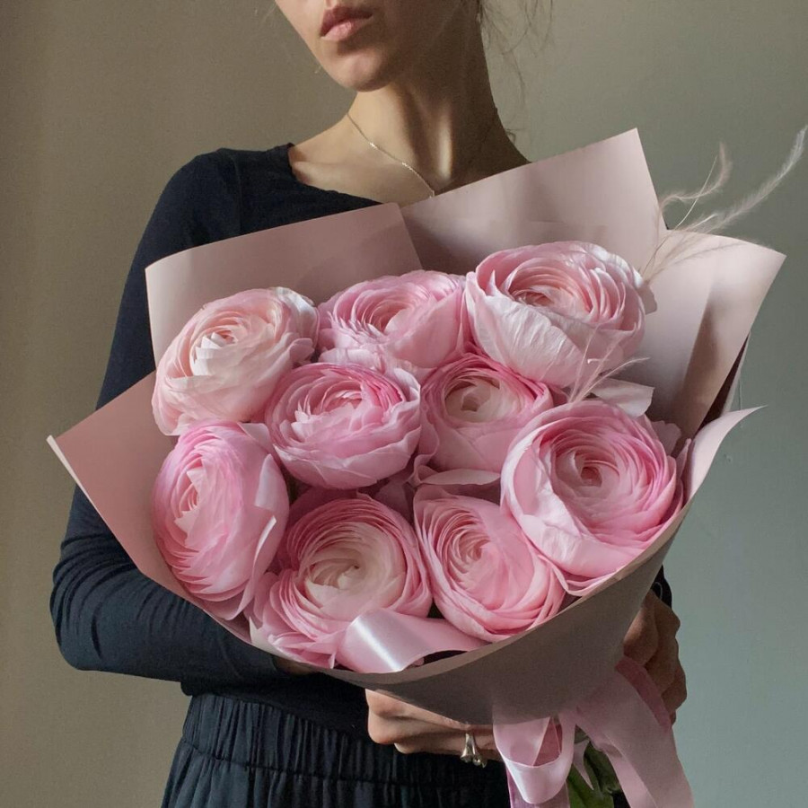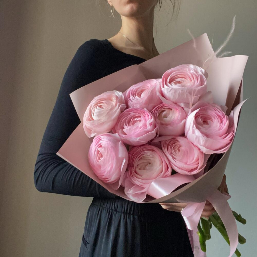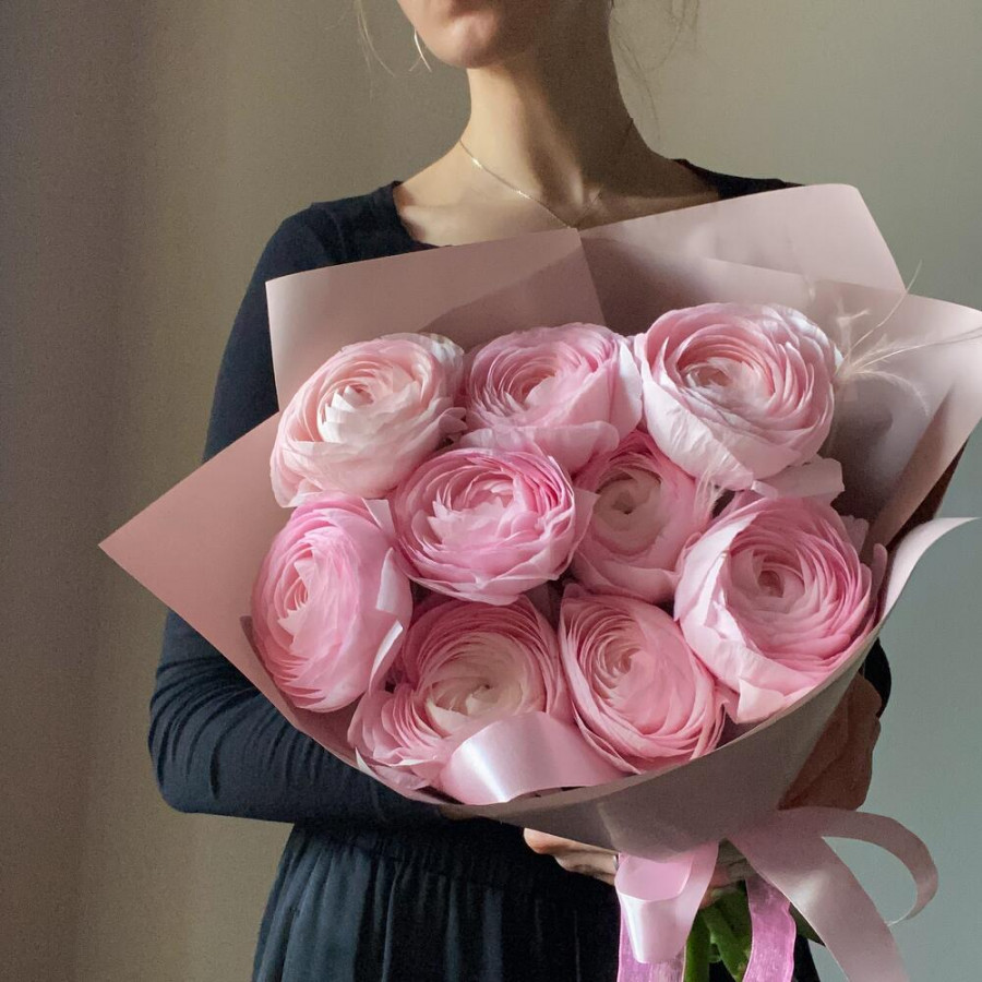 На фото букет из 9 розовых ранункулюсов. В составе: ранункулюс 9 шт, дизайнерская упаковка 1 шт, атласная лента 1 шт, . Все цветы свежие и ароматные, букет красиво оформлен и отлично подходит для подарка. Доступна доставка цветов или самовывоз.