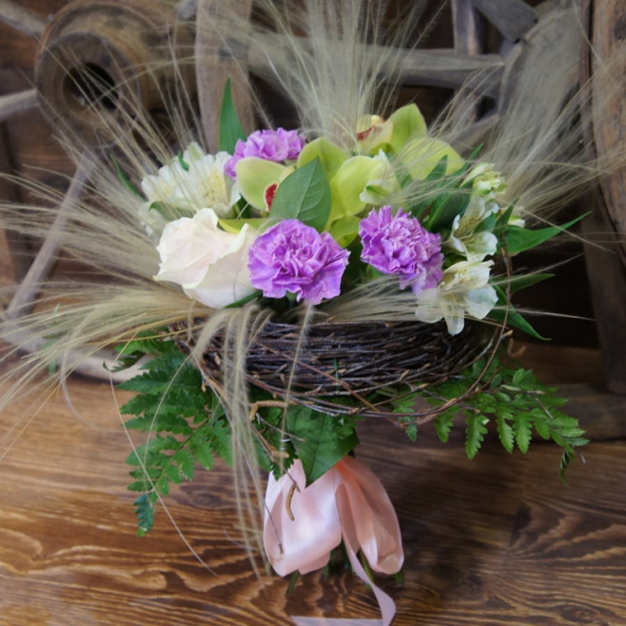 Необыкновенное исполнение этой композиции вызывает восторг как у прекрасной половины человечества, так и у мужчин. Только что срезанные орхидеи и гвоздики, роза, украшенные листьями папоротника декоративной зеленью и вкраплениями альстромерий, будут на протяжении длительного периода радовать счастливого обладателя своим непревзойденным ароматов и элегантным дизайнерским исполнением.