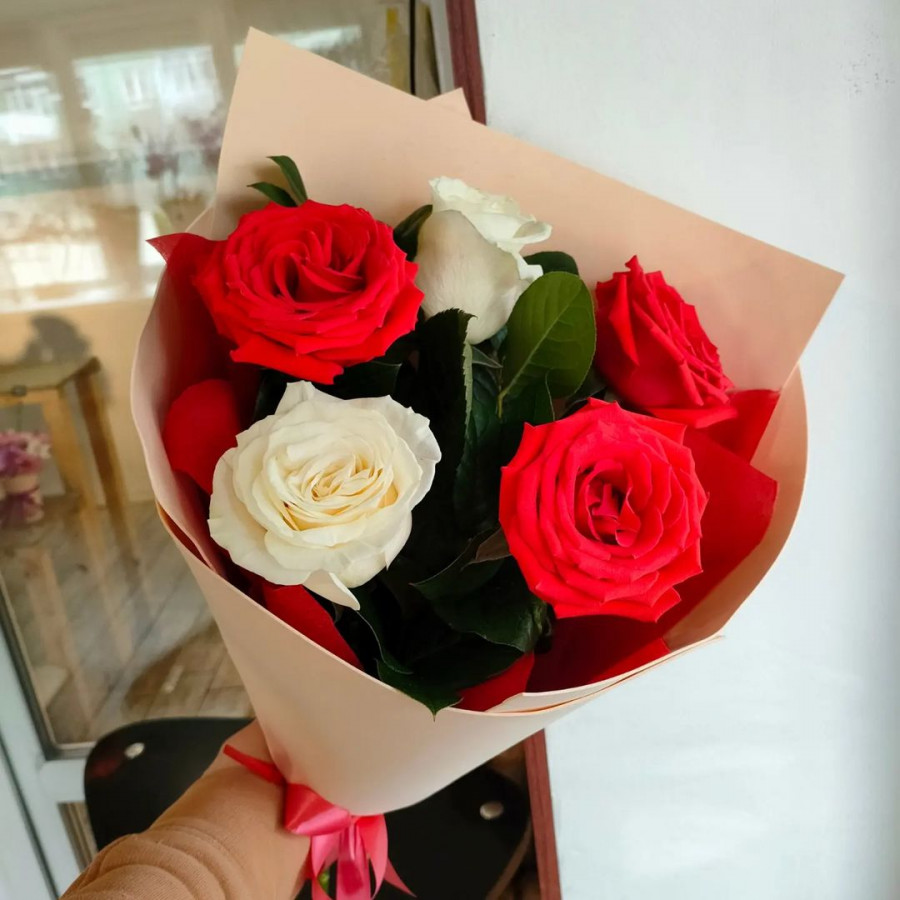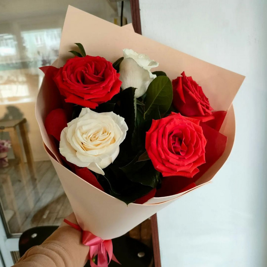 На фото букет из 5 красных и белых роз. В составе: роза 5 шт, крафт-бумага 1 шт, атласная лента 1 шт, . Все цветы свежие и ароматные, букет красиво оформлен и отлично подходит для подарка. Доступна доставка цветов или самовывоз.
