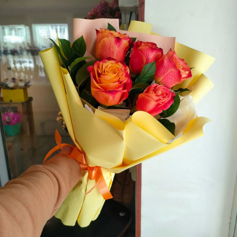 На фото букет из 5 оранжевых роз. В составе: роза 5 шт, крафт-бумага 1 шт, атласная лента 1 шт, . Все цветы свежие и ароматные, букет красиво оформлен и отлично подходит для подарка. Доступна доставка цветов или самовывоз.