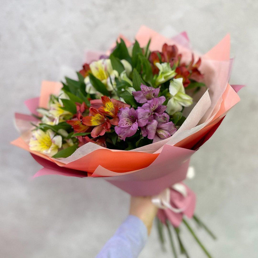 На фото букет из 9 разноцветных альстромерий. В составе: альстромерия 9 шт, крафт-бумага 1 шт, атласная лента 1 шт, . Все цветы свежие и ароматные, букет красиво оформлен и отлично подходит для подарка. Доступна доставка цветов или самовывоз.