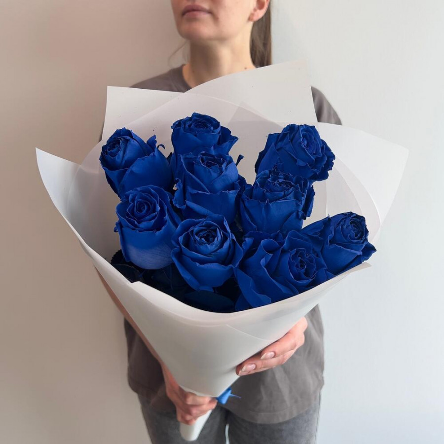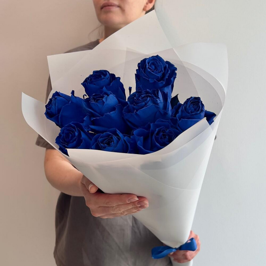 На фото букет из 9 синих роз. В составе: роза 9 шт, дизайнерская упаковка 1 шт, атласная лента 1 шт, . Все цветы свежие и ароматные, букет красиво оформлен и отлично подходит для подарка. Доступна доставка цветов или самовывоз.