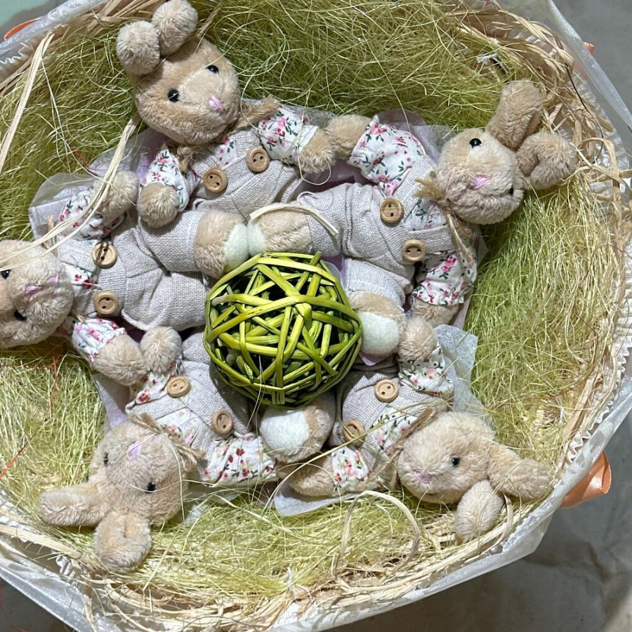 На фото букет из игрушек зайчат в платье. В составе: . Все цветы свежие и ароматные, букет красиво оформлен и отлично подходит для подарка. Доступна доставка цветов или самовывоз.