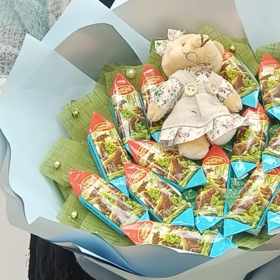 Лента атласная - 1 шт. Упаковка дизайнерская - 2 шт. Мишка плюшевый - 1 шт. бусинки - 25 шт. конфеты мишка косолапый - 14 шт.