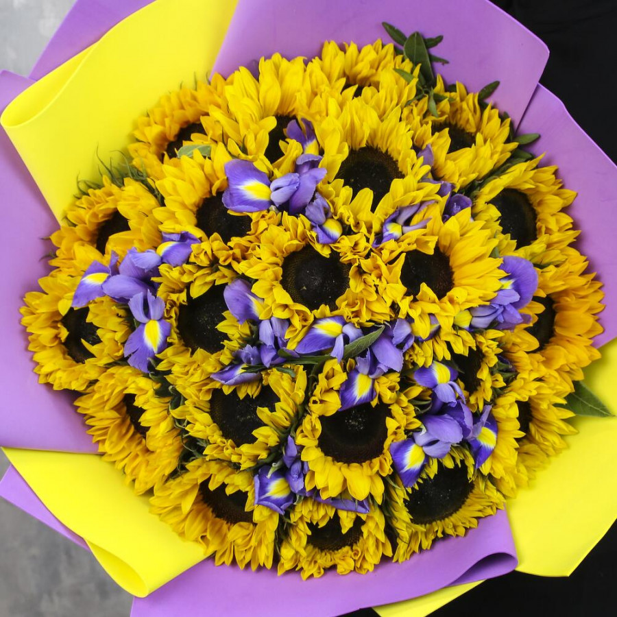 Букет из подсолнухов и ирисов