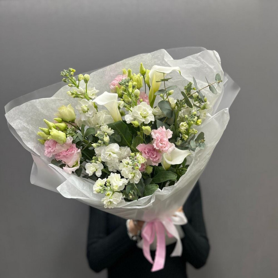 На фото букет «королевский акцент». В составе: калла 3 шт, эустома (лизиантус) 3 шт, маттиола 5 шт, эвкалипт 1 шт, дизайнерская упаковка 2 шт, атласная лента 1 шт, . Все цветы свежие и ароматные, букет красиво оформлен и отлично подходит для подарка. Доступна доставка цветов или самовывоз.
