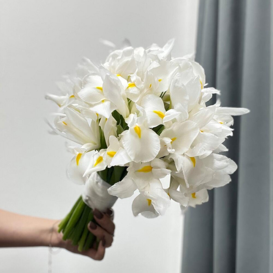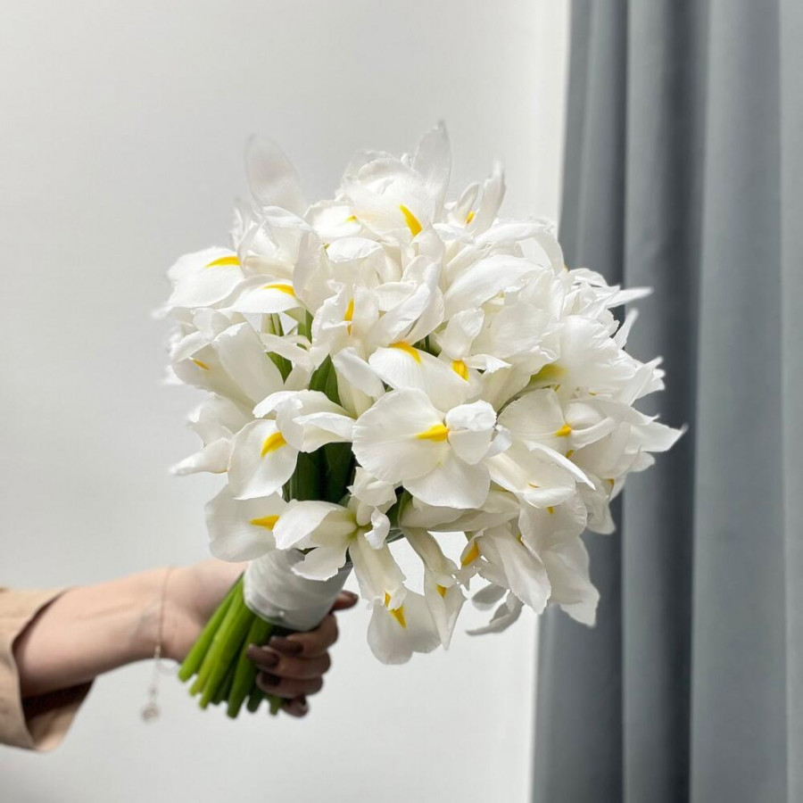 На фото букет невесты из белых ирисов. В составе: ирис 25 шт, атласная лента 3 шт, . Все цветы свежие и ароматные, букет красиво оформлен и отлично подходит для подарка. Доступна доставка цветов или самовывоз.