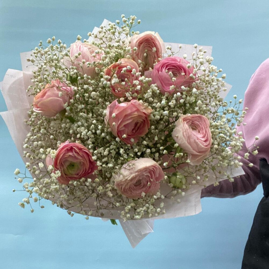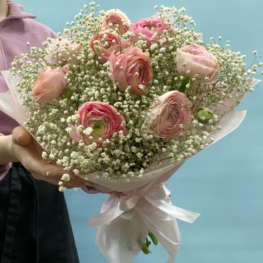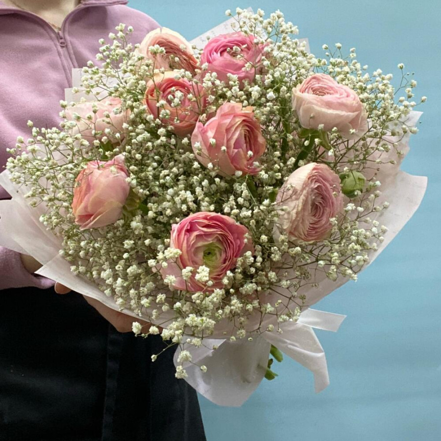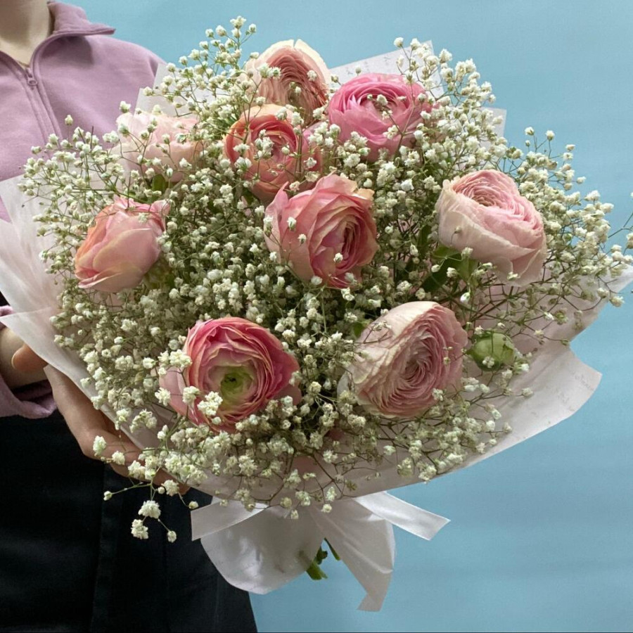 Букет из розовых ранункулюсов с белой гипсофилой в Рузаевке