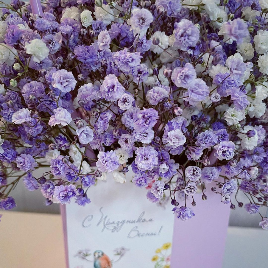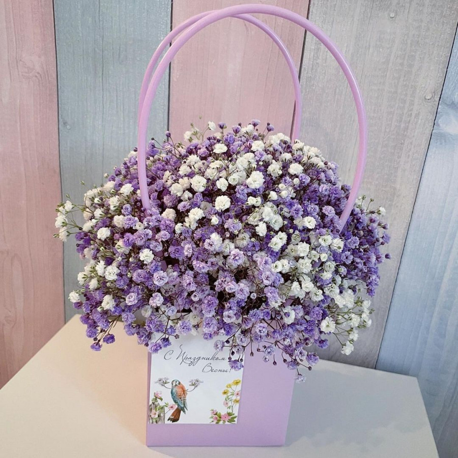 На фото композиция из 11 сиреневых гипсофил в сумочке. В составе: гипсофила 11 шт, плайм-пакет 1 шт, атласная лента 1 шт, . Все цветы свежие и ароматные, букет красиво оформлен и отлично подходит для подарка. Доступна доставка цветов или самовывоз.