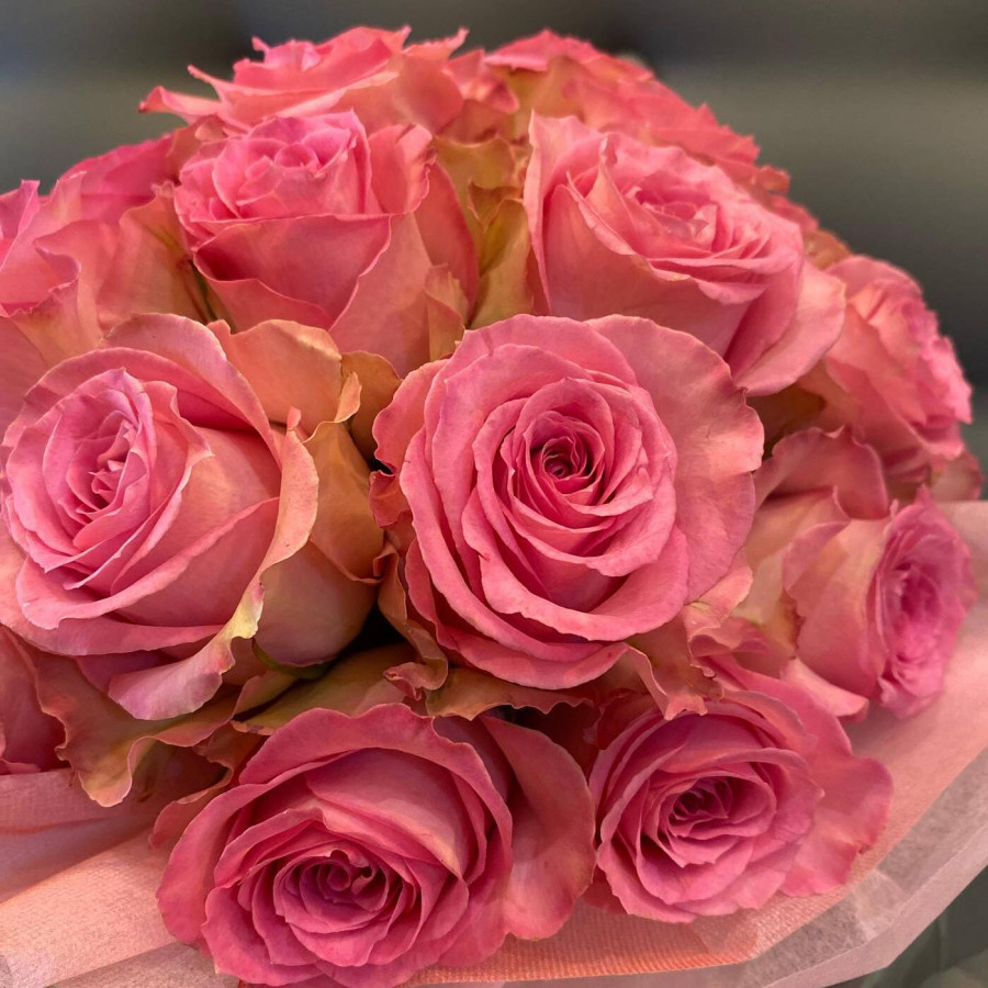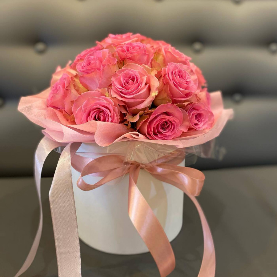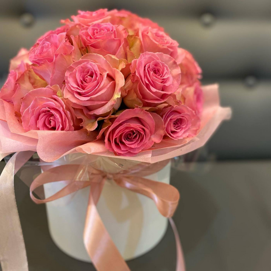 На фото композиция из 15 розовых роз в белой коробке. В составе: роза 15 шт, коробка (s) 1 шт, атласная лента 1 шт, . Все цветы свежие и ароматные, букет красиво оформлен и отлично подходит для подарка. Доступна доставка цветов или самовывоз.